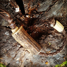 Últimamente las bobinas de hilo no vienen como antes. Antes eran de cartón pero tenían topes en los extremos que evitaban que el hilo de capas del enrollado profundo se salgan pero ahora viene el hilo enrollado en un tubo liso uniforme de plástico sin topes y el hilo suele patinar y armarse un verdadero enredo. Mientras hace unos días tallaba madera para la trampa que publiqué se me ocurrió hacer un carretel y por qué no hueco? Como verán en la base tiene un corte en diagonal para enganchar la punta del hilo y que se meta en la madera evitando que se desenrolle. Luego en las siguientes fotografías pueden ver que le practiqué orificios pasantes tanto en la base como en el tapón de manera que pasando una cuerda fina al tirar de ella el tapón queda apretado con el cruce de la cuerda. En las últimas dos fotos vuelvo a mostrarles mi costurero que hice al estilo saami con asta de ciervo. Mientras esté colgado de la trenza tanto agujas como hilos quedan atrapados con el tapón. Ellos solían usarlo colgado en el cinturón. A esas temperaturas bajo cero arreglar la vestimenta es cuestión de vida o muerte.